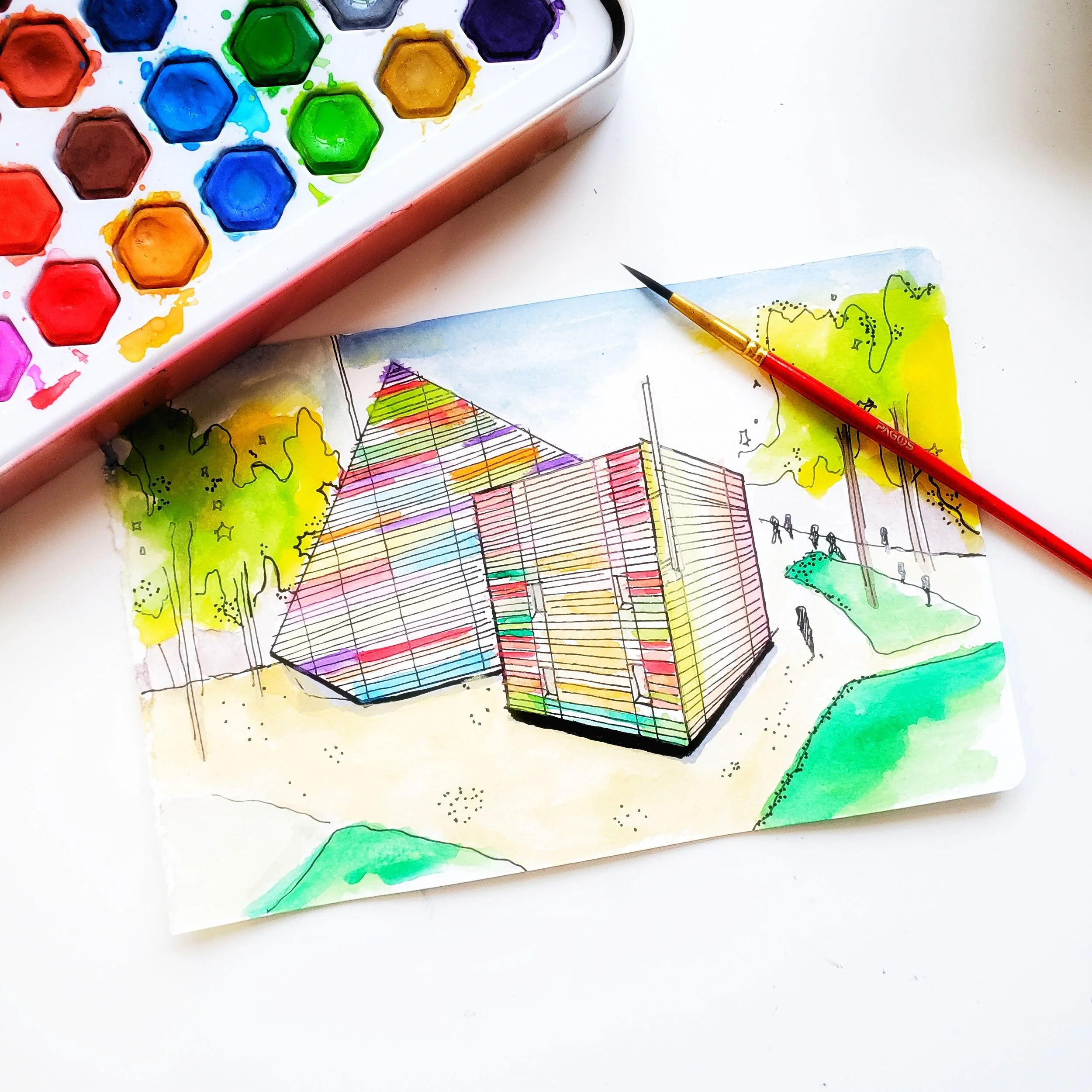 A PROJECT BORN DURING COVID-19 LOCKDOWN, “ONE ARCHI, ONE DAY” IS AN ATTEMPT TO VIRTUALLY TRAVEL AROUND THE WORLD THROUGH DAILY 60-MINUTE SKETCHES OF ARCHITECTURE, INTERIORS, AND STAGE DESIGNS THAT INSPIRE ME IN DIFFERENT WAYS. IT’S A CELEBration of the world filled with such diversity, and cultural expressions through built environment where we live, play, and congregate.